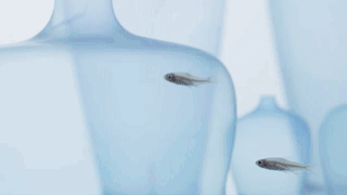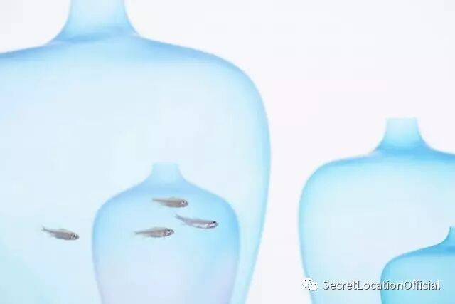 设计师Nendo 的这些花瓶由超薄透明硅胶制做、染色而成,被放置在 Jil Sander 展厅的水族馆中,轻盈而柔软的花瓶会随着水波的摆动像水母一样游弋,美得通透空灵。